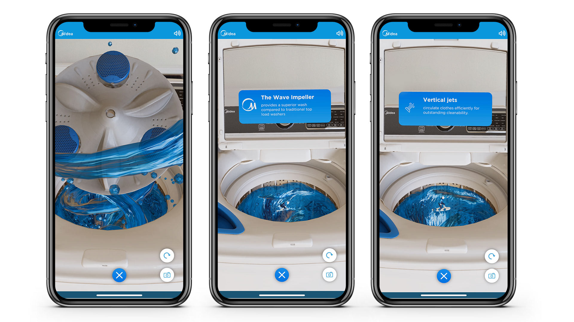 Midea America Corporation specializes in home appliances such as refrigerators, air conditioners, laundry appliances, and much more. They called on Groove Jones to create the augmented reality experience to promote their new Wave-Impeller 4.5-cu ft High-Efficiency Impeller Top-Load Washer. This retail AR experience utilized native AR to bring it to life.