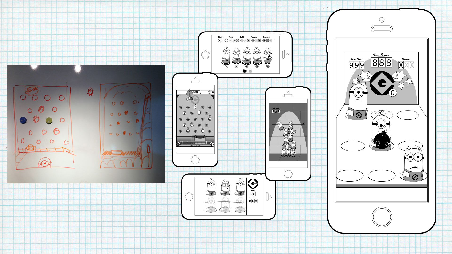 Mobile App for Despicable Me 2 AR Theater Experience. Attached are some images showcasing the initial concepting ideas, whiteboarding, wireframes and then final developed app.